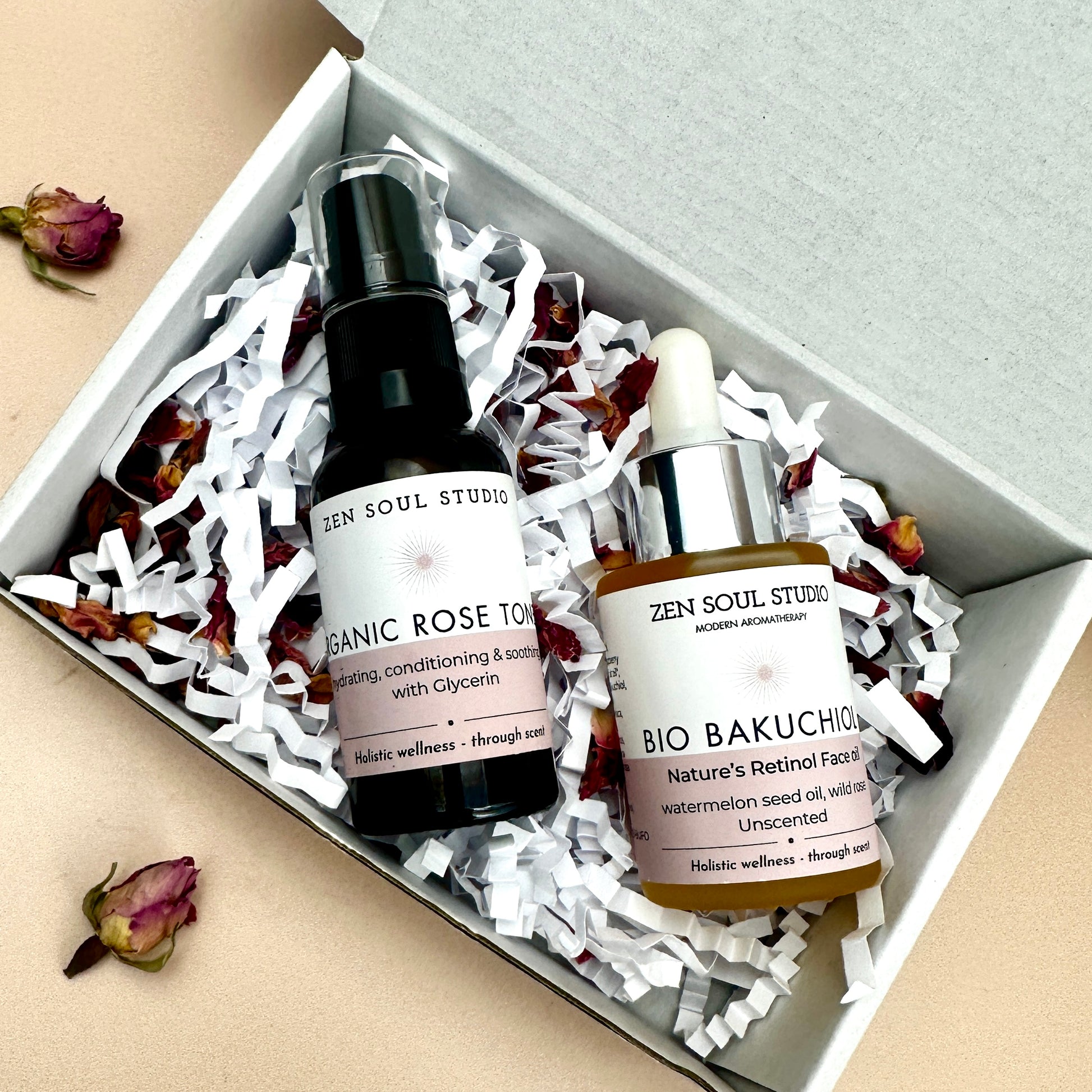 A calming duo for soft, balanced skin: Organic Bulgarian Rose Toner with Glycerin and Award-Winning Bio Bakuchiol Face Oil with Bulgarian Rose & Frankincense. Designed to hydrate, nourish, and soothe, this set is perfect for sensitive, dry, or mature skin.